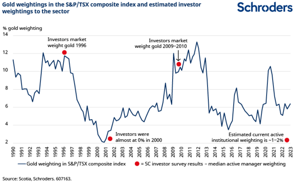 Ten tweede blijven aandelen van goudproducenten op lange termijn goedkoop en zijn beleggers nog steeds extreem onderwogen Twee recente grafieken van Scotia, een Canadese broker, maken dat duidelijk. De eerste grafiek hieronder laat zien dat de beleggers momenteel bijna geen positie in goudaandelen hebben (zie de rode stip). Ondertussen blijft het gewicht van goudaandelen in de S&P/TSX Composite Index (Canada's benchmark aandelenindex) historisch laag. Het grondstofrijke Canada heeft een aantal beursgenoteerde goudproducenten, en daarom is hun gewicht in deze index een nuttige leidraad voor de belangstelling van de beleggers voor goudaandelen.