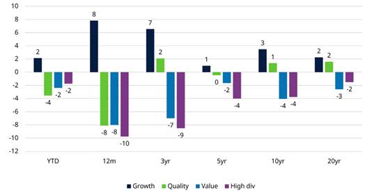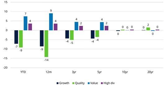 Afbeelding: Waarde en Dividend gaan voorop in in EAFE. Groei en Kwaliteit zijn achtergebleven.