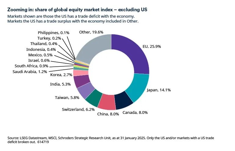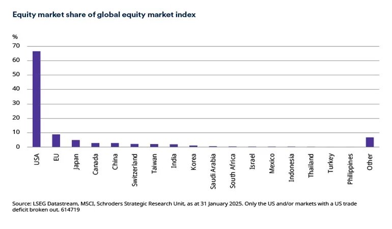 For equity markets, the US is the dominant market in the MSCI All Country World Index, which includes both developed and emerging markets, with a share of 66% as at 31 January 2025. Equity markets of those economies with which the US has a trade deficit account for around 27% of the index. The EU is largest with a share of 9%, followed by Japan and Canada with 5% and 3% respectively.