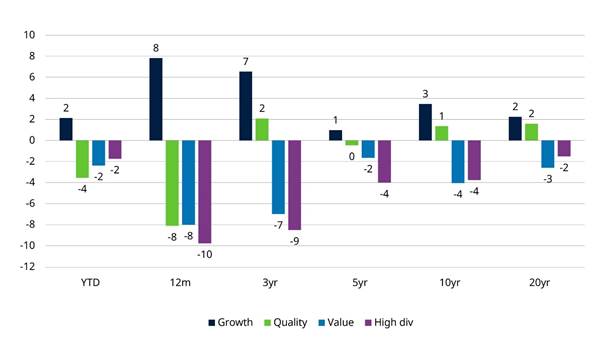 In the US, Growth companies have been rewarded for their better earnings growth (driven by technology companies). Outside it they have not. EAFE Growth companies have underperformed despite having superior earnings growth. Rising valuations have been in the driving seat for Value and High Dividend styles. They’ve done very well despite weak earnings. This is partly a reversal of the valuation extremes that existed previously (see later section), and which still exist in the US. Arguably, downgrades to the outlook for Quality earnings over the past 12 months are consistent with poorer relative performance. An appeal of Quality stocks is the robustness of their businesses, so any weakness on that front is unlikely to go down well.
