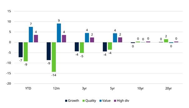In EAFE (Europe, Australasia, and the Far East, a stock market index designed to represent global developed markets excluding North America), Value returned 20% in USD terms in the 12 months to 31 August 2025, outperforming the market by 6% and “Growth” stocks by 13%. Growth stocks themselves lagged the market by 6%. This is the reverse of the US experience that we read about all the time. Stateside, Value has underperformed Growth by 17% and the market by 8% in the past year. The scale of these recent performance swings in EAFE are so great that they now also feed into more medium-term numbers. Over three- and five-year horizons, Value is well ahead of Growth and the market. European and UK Value stocks (MSCI EMU Value and MSCI UK Value) are not only ahead of their Growth equivalents, they’re also ahead of the S&P 500 over the past five years (in both common currency and local currency terms).