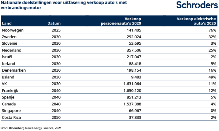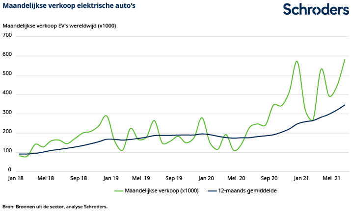 De verkoop van elektrische auto's (EV) is dit jaar fors gestegen. In de 12 maanden tot juni 2021 werden er ruim 160% meer EV's verkocht dan in diezelfde periode een jaar eerder, en ruim 130% meer dan in dezelfde periode in 2019. Dit bleek uit de jongste editie van het klimaatdashboard van Schroders.