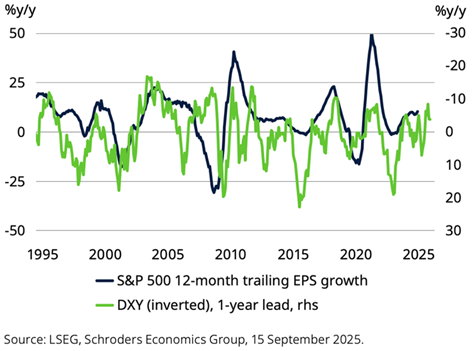 Een zwakkere dollar heeft gemengde gevolgen voor de wereldwijde aandelenmarkten. Doorgaans stimuleert dit de bedrijfswinsten in de VS door een verbeterd exportconcurrentievermogen en een omrekening van buitenlandse inkomsten. Maar de bredere impact op Amerikaanse aandelen is waarschijnlijk negatief als de daling van de dollar een weerspiegeling is van afnemend beleggersvertrouwen en stijgende risicopremies. Dat kan de obligatierente doen stijgen en de waarderingen drukken.